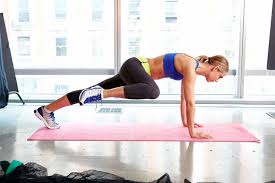 - Start in a high plank (hands under shoulders, legs extended, feet hip-width apart, back straight, abs engaged).
