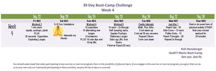 Here’s Week 4 of the 30 Day Boot-Camp Challenge. Enjoy.