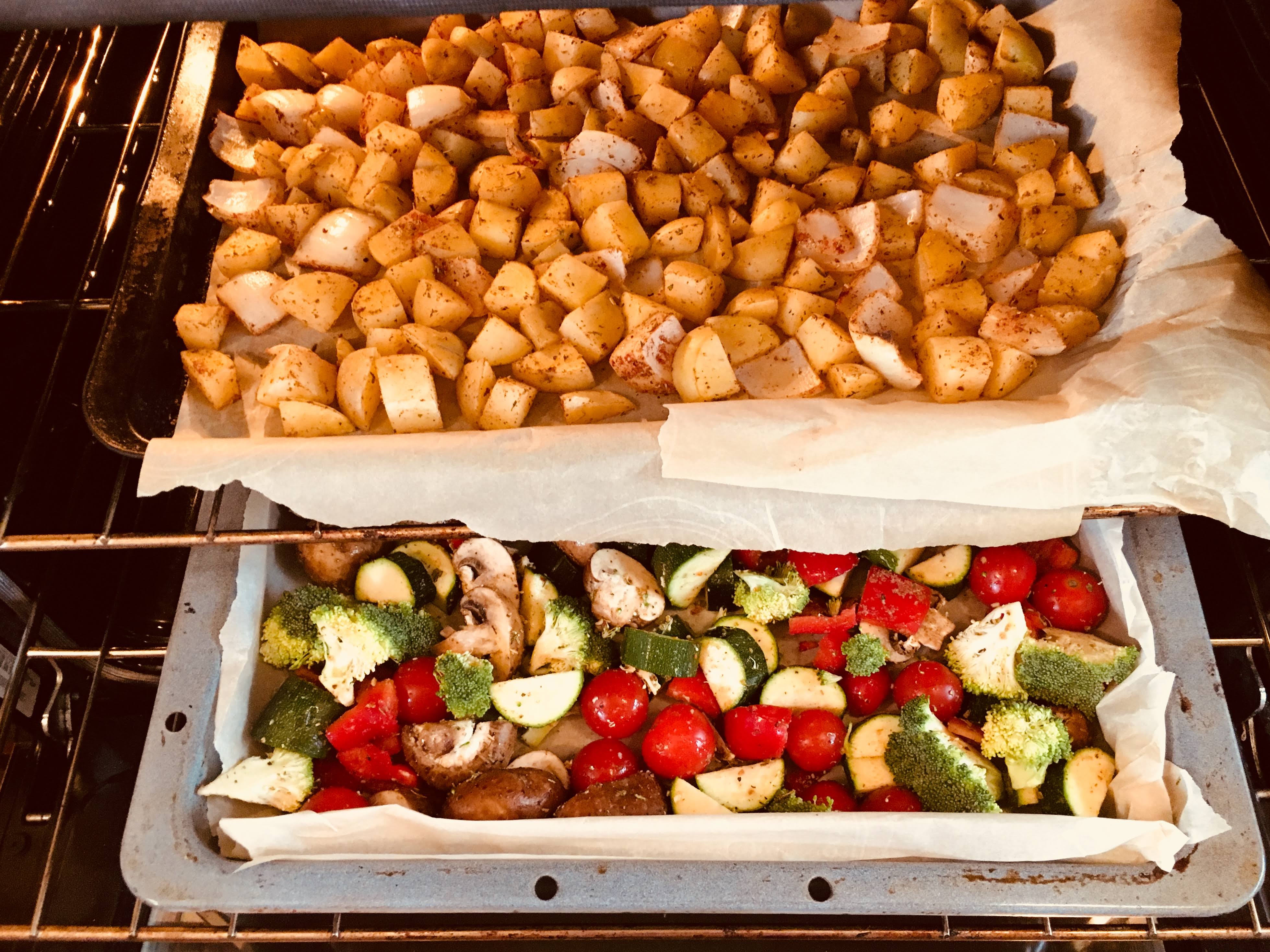 1.  Make a shit ton of veggies.  And yes, that includes potatoes.   These little pans above took 23 minutes from the first chop to being put in the oven.  45 min in a 425 degree oven.  Done.