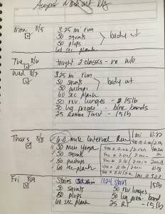 So I got out a notebook and wrote out my detailed workout plan for the week; Monday through Sunday. I wrote out the plan for each day. Miles to run, exercises to do, etc. Then (as I love to do) a space to check it off.