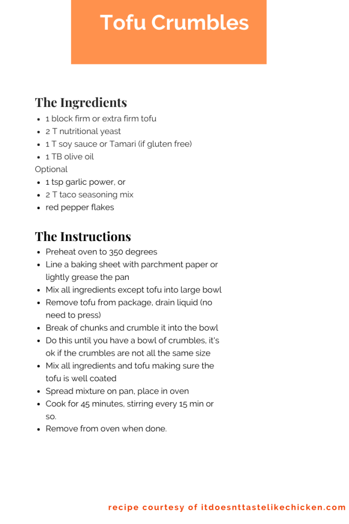 Tofu Crumbles – These are perfect in chili, tacos and you can mix them with lentils in a vegan sloppy joe. My family was *floored* when I shared that it was tofu. And my 14 year old is a harsh critic! Click here for a printable copy.
