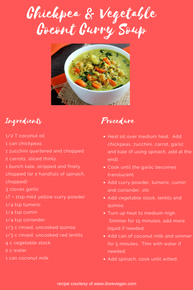 This is why I had a shout out to my “personal assistant”. Sadly she just gave me dessert recipes Which I don’t mind (note to self for later), but it wasn’t what I was looking for. So the Google search bar was my next stop. A recipe for “Chickpea & Vegetable Coconut Curry Soup” popped up. Bingo. Bonus points for it coming from a vegan website, www.ilovevegan.com.