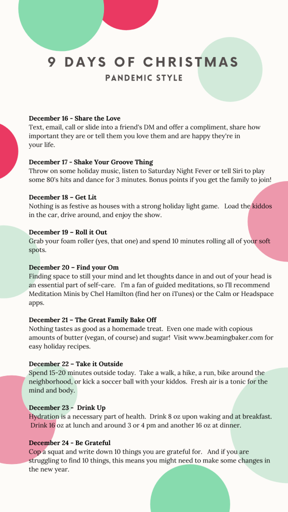 So according to my math (every one of my boot-camp members just spit out their coffee), we have 9 days until Christmas and I thought we should do a Christmas countdown with 9 daily tasks/actions/activities that will get you in the spirit of the season, provide an excuse for self-care, or is just fun and silly! If you don’t celebrate Christmas – shout out to my friends celebrating Hannukah or Kwanza – please play along.