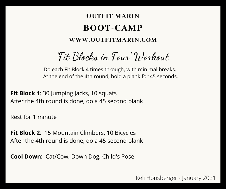 After each 4 minute Fit Block, you’ll do a 45 second plank. It’s not part of the 4 minutes or 4 rounds. It’s what we call a “cash out”. It’s like when you leave one casino for another. You cash out. I guess. I don’t gamble.