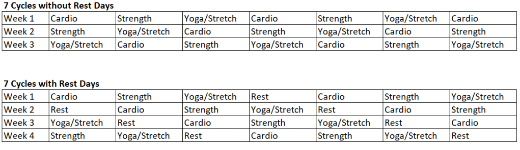 I created this program to help you get back on track with your fitness plan, focusing on cardiovascular conditioning, building strength, and gaining/retaining mobility and flexibility. The workouts are designed to be done 3 days in a row which we call a cycle.