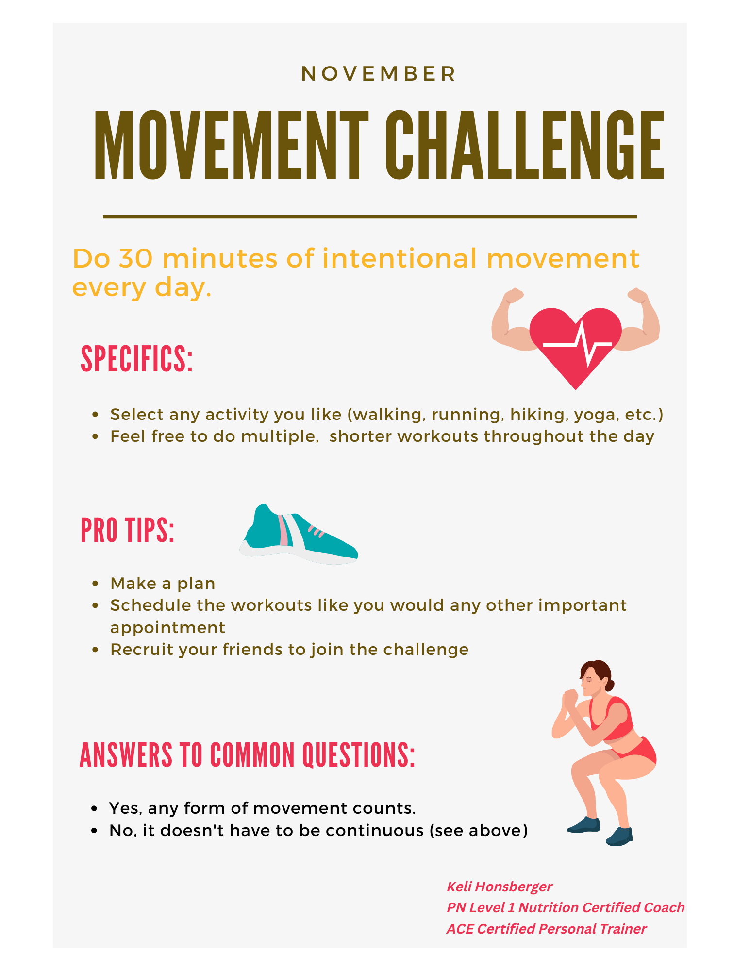 This is the simplest of all challenges; your goal is to do some intentional movement/activity for 30 minutes daily. Take a 30- minute strength class, walk, do three 10-minute walks, do yoga, etc.